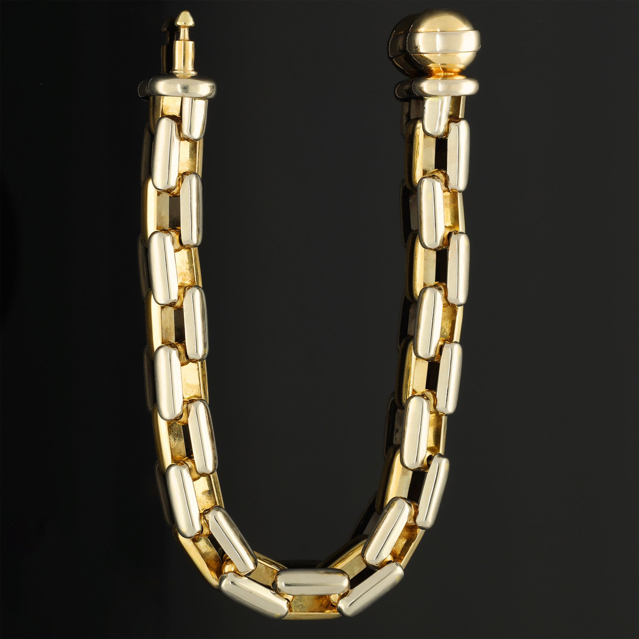 Get ready to amp up your daily style with this vintage chunky anchor chain link bracelet—a solid 18k gold stunner weighing 35.2 grams that's an absolute showstopper! Crafted with alternating white and yellow gold links, this bracelet is not just a substantial stacking piece; it's a bold expression of style.