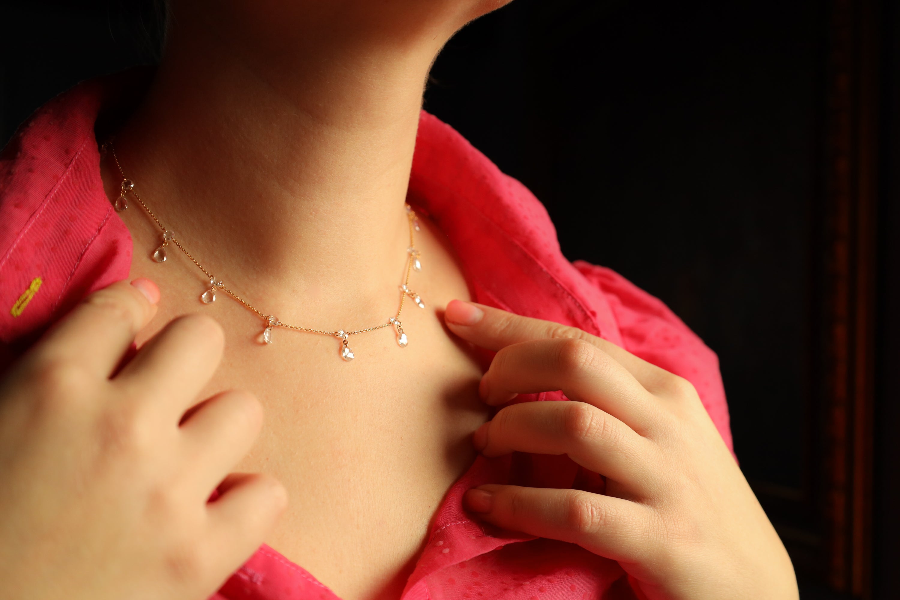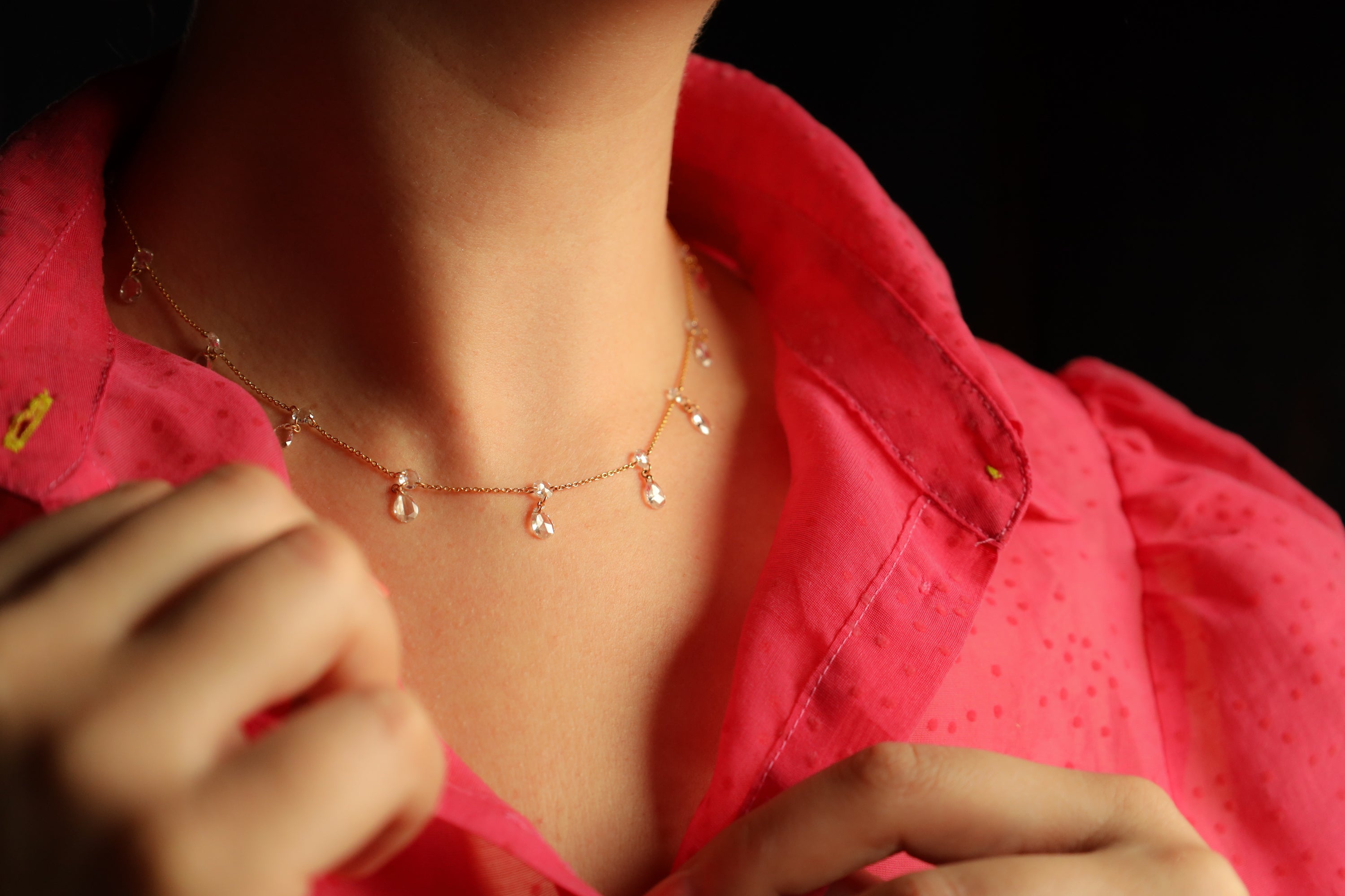 Adorned with 24 sparkling old style "rose cut" floating diamonds, this diamond necklace can be combined with a matching lariat necklace for an ultimate quite luxury effect!