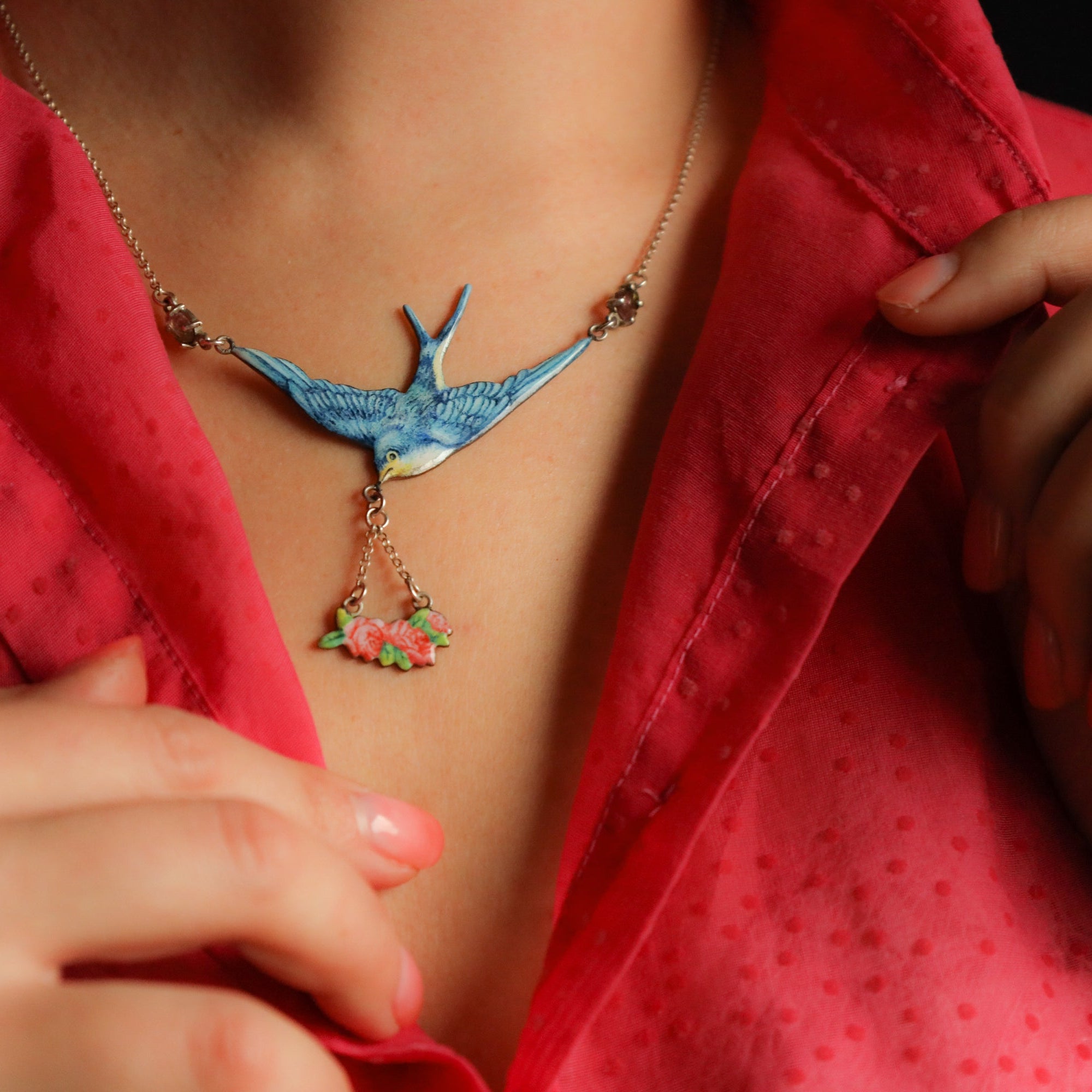 A perfect love token piece and a finest example of antique animal jewelry! Romantic and very symbolic this bird necklace depicts a flying swallow. The swallow pendant is set with blue enamel and accented with two watermelon tourmaline cabochons on it's sides. The bird has a fine feather detailing and is carrying a rose bouquet.
