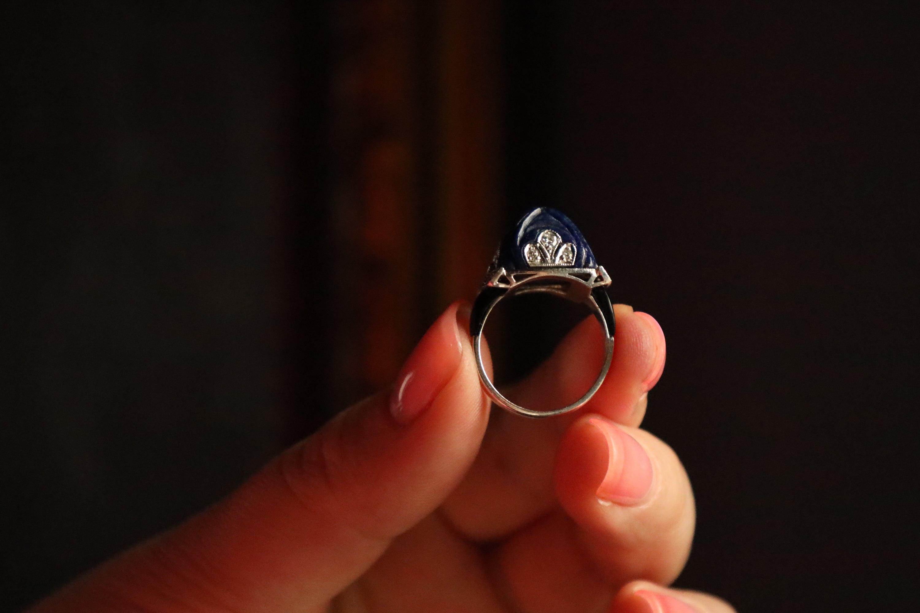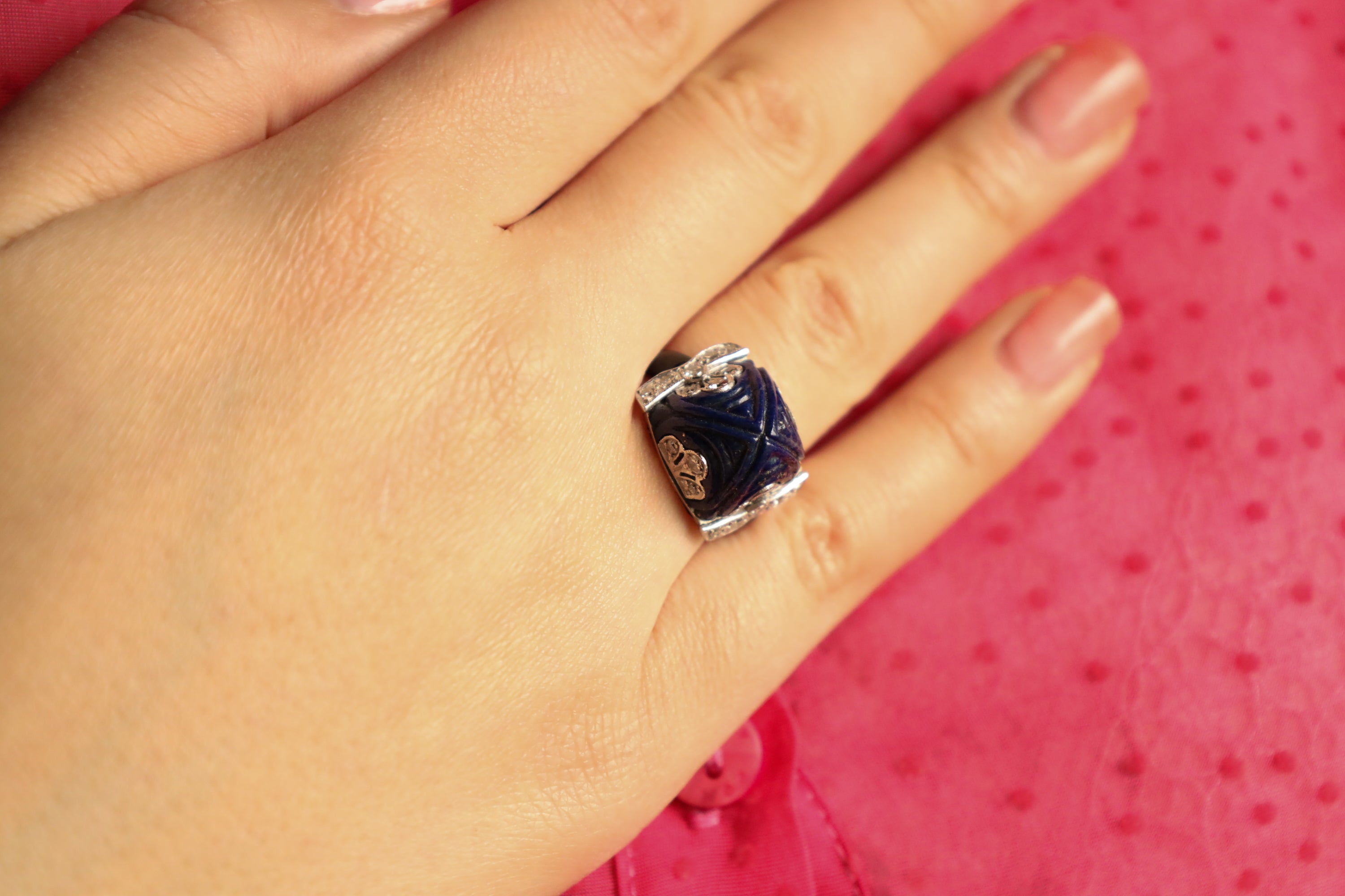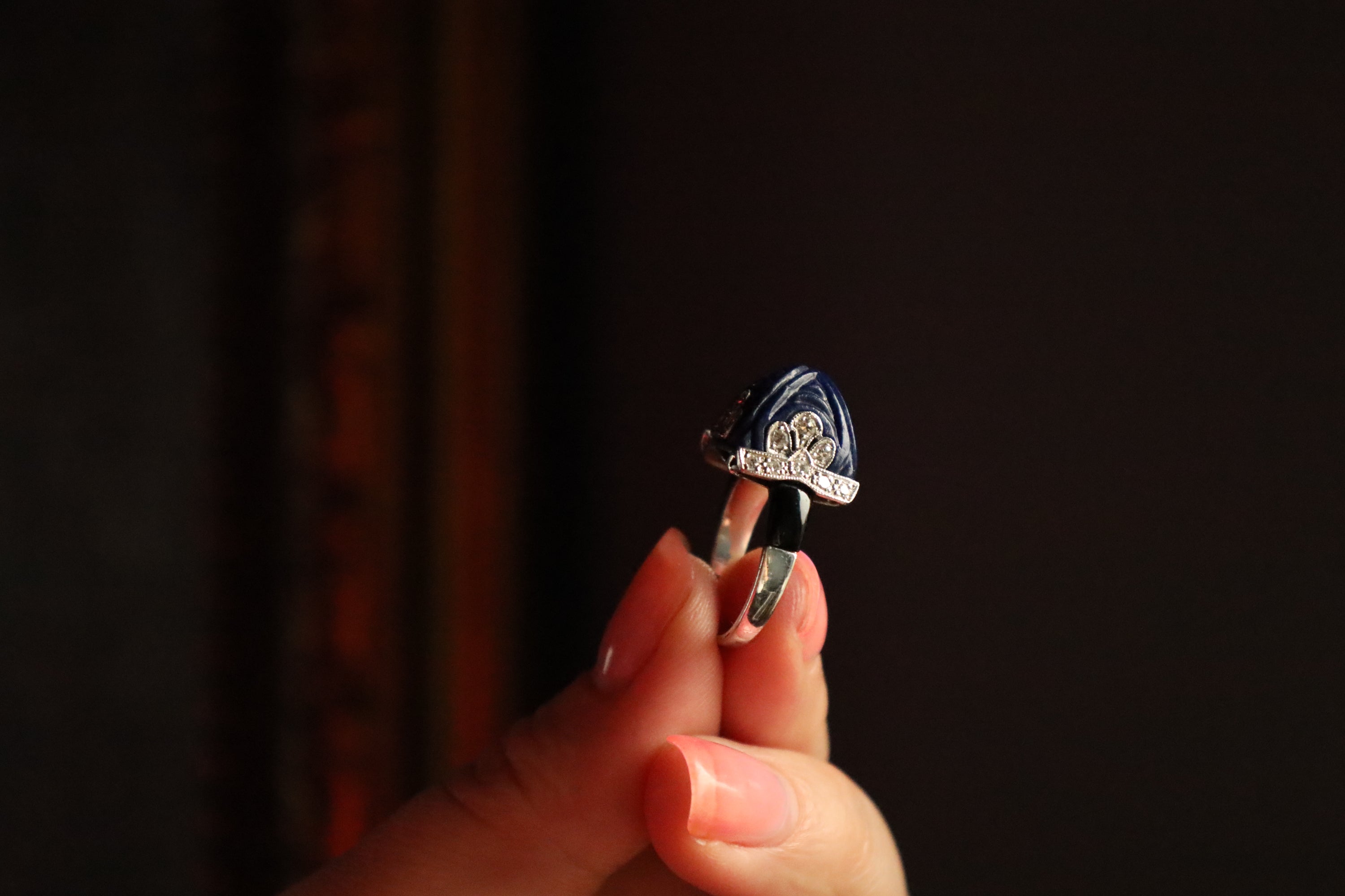 Art Deco Pyramid Ring with Carved Lapis Lazuli and Diamonds